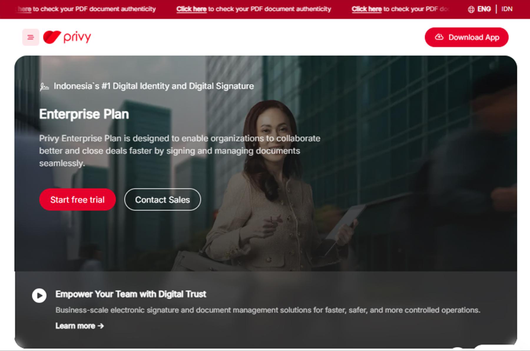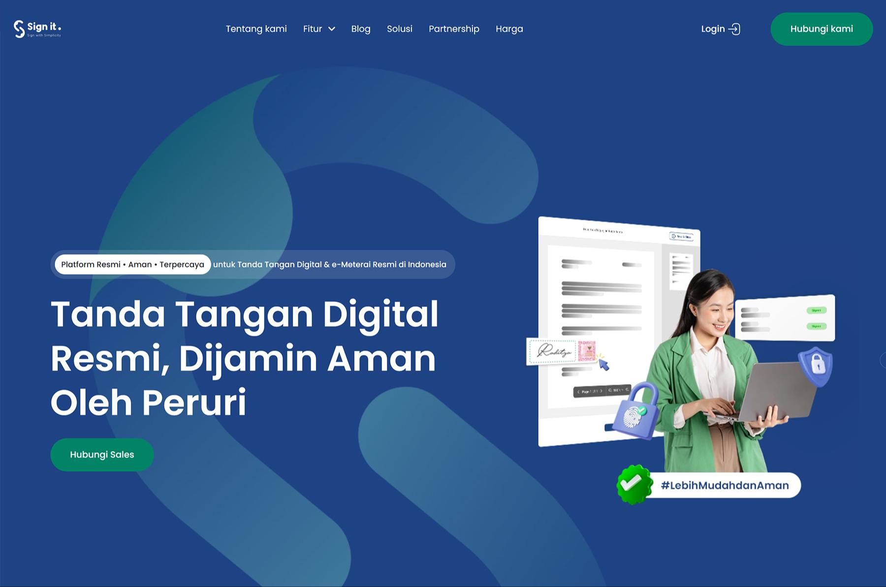 Layanan Utama: Menyediakan solusi Tanda Tangan Elektronik bersertifikat dengan fokus pada fitur security dan fleksibilitas akses di Indonesia.