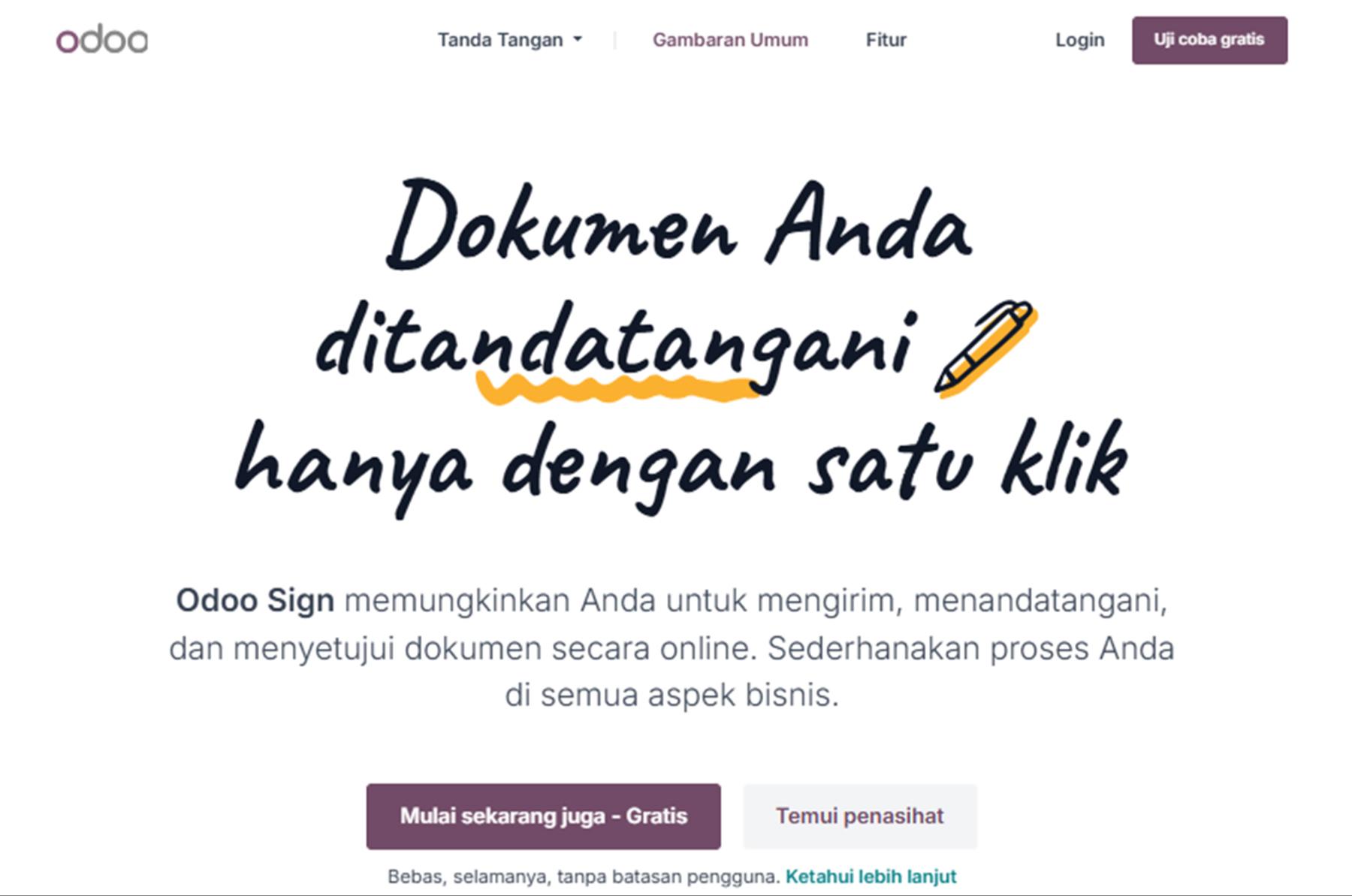 Layanan Utama: Solusi tanda tangan yang terintegrasi erat di dalam ekosistem ERP Odoo, ideal untuk otomatisasi bisnis.